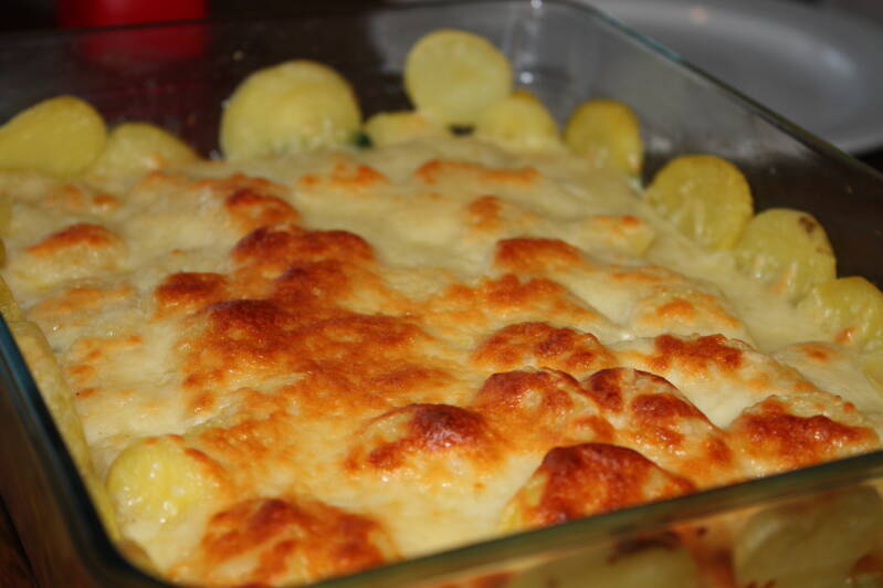 - Bedek de zijkanten van de ovenschaal met één rij aardappeltjes en niet tot aan de rand.