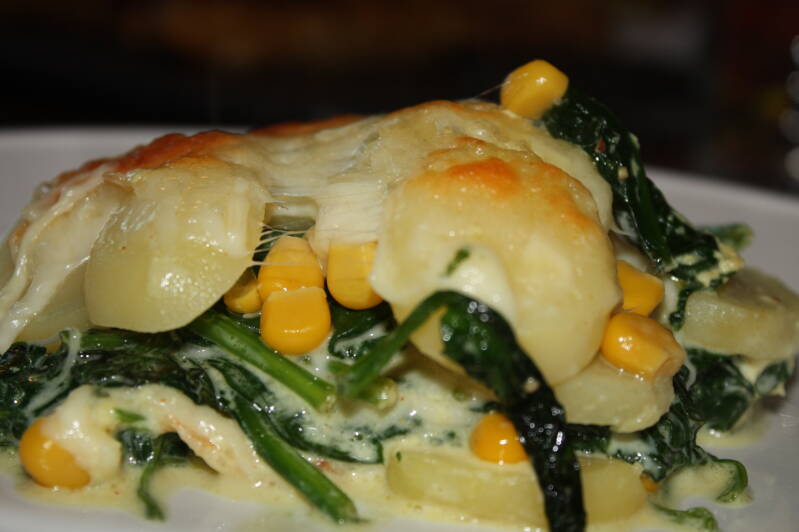 - Bedek de spinazie in de ovenschaal met een tweede laagje aardappelschijfjes.