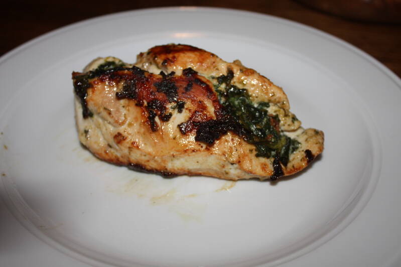 - Als de kipfilet is open gesneden doe je de vulling er met een lepel tussen.