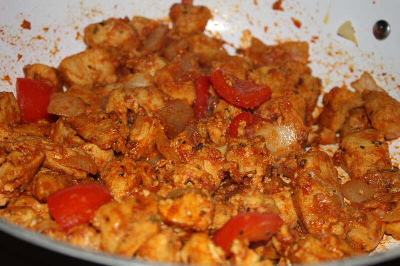 Terwijl ik bezig was met het bakken van deze overheerlijke shaslicks kwam ik erachter dat ik veeeelste veel kipfilet, paprika en ui had gesneden. Ik vond het zonde om weg te gooien en voegde het toe samen met ei en een eetlepel bolognese pastasaus. Dit simpele eenpansgerecht vond ik stiekem nog lekkerder dan de shaslicks zelf.