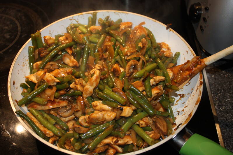 - Als ook de kip goed gaar is doe je deze ook in de pan bij de champignon, ui en boontjes.