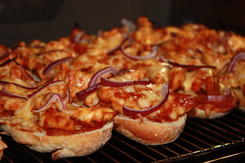 - Verdeel nu de kipfilet over de halve stokbroden.