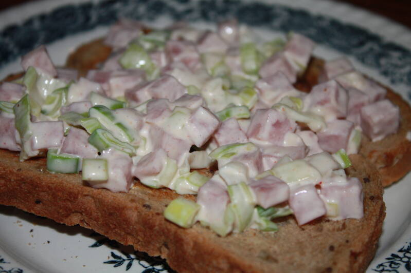 - Doe de hamblokjes, mayonaise en kruiden (naar smaak) in de schaal waar je de salade in gaat maken.