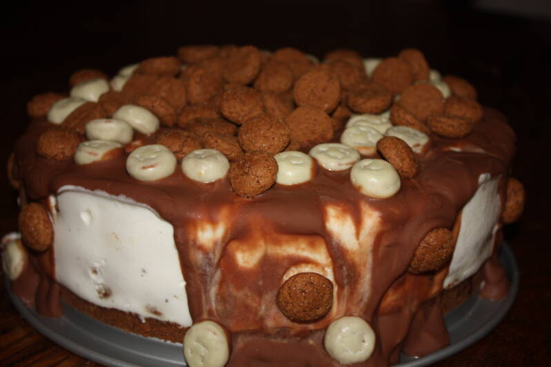 - Smeer heel voorzichtig de chocolade over de taart (het mag er naast druipen, dit geeft een speels effect). Veeg de chocolade niet te fanatiek over de taart want dan smelt de taart en mixt het met de chocolade (als dit gebeurt geen paniek!).